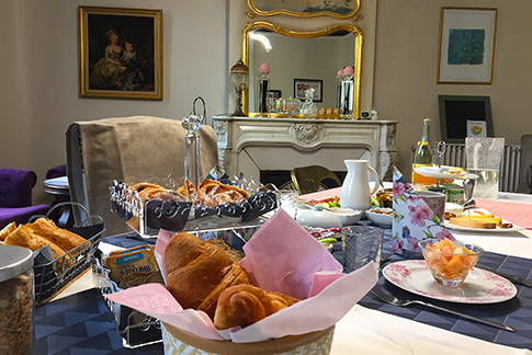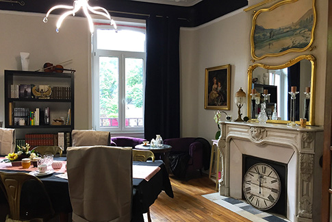 Le salon des hôtes, style boudoir, se situe au rez de chaussée et reflète l'esprit de notre maison 1900 avec une belle hauteur sous plafond, une cheminée en marbre avec trumeau d'origine et parquet de chêne. Les petits déjeuners seront servis autour de la grande table du salon.